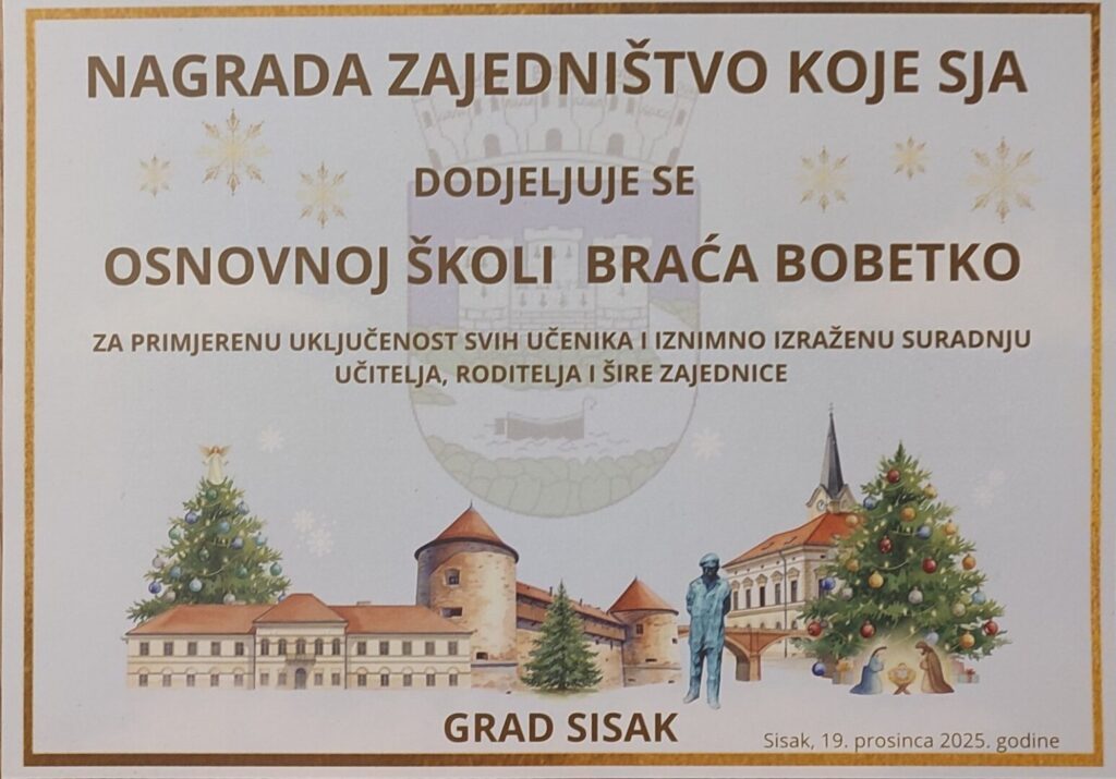 Naša škola sudjelovala je u natječaju Grada Siska za najljepše uređenu školu povodom blagdana. Naš velik trud i zajedništvo pri uređenju su se isplatili – osvojili smo nagradu „Zajedništvo koje sja“ za uključenost svih učenika i snažnu suradnju učitelja, roditelja i šire zajednice u ukrašavanju škole.